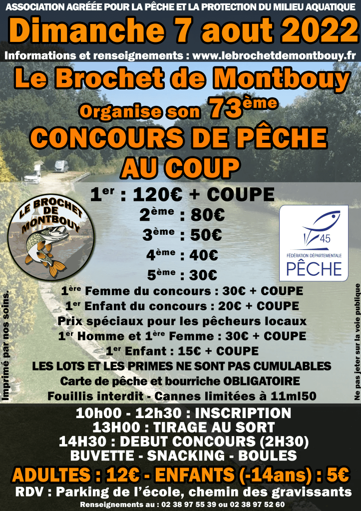 Le dimanche 7 Aout , l’AAPPMA le Brochet de Montbouy organisera son 73ème concours de pêche sur le canal de Briare.